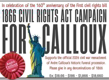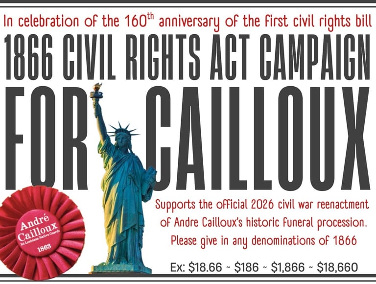 In celebration of the 160th anniversary of the first Civil Rights Act of 1866, the one that ensured Black People would be considered 'citizens' --we are having an 1866 Campaign for Cailloux. Capt. Andre Cailloux fought and died so valiantly for our freedom, a freedom that affords us the RIGHT to fight for Civil Rights, again and again and again. Like, damn, in 2025 we are STILL fighting but we would not be able to so if Cailloux and the other 200,000 Black men had not fought for that initial freedom. Donate any denomination of 1866.